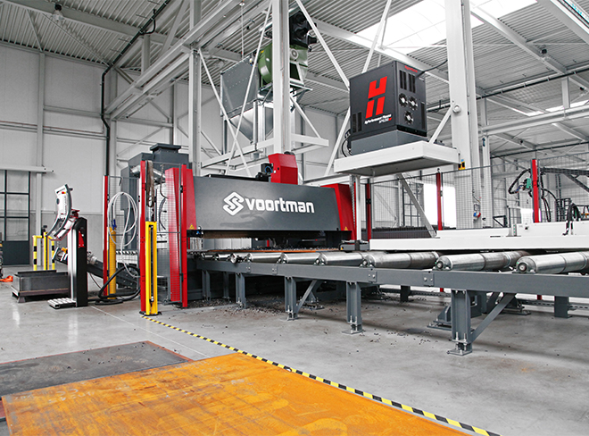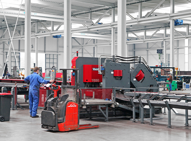 In deze productiehal staat een CNC gestuurde boor- zaagmachine voor het bewerken van staalprofielen. De profielen worden hier ook voorzien van gefreesde markeringen voor de bevestiging van de schetsplaten.