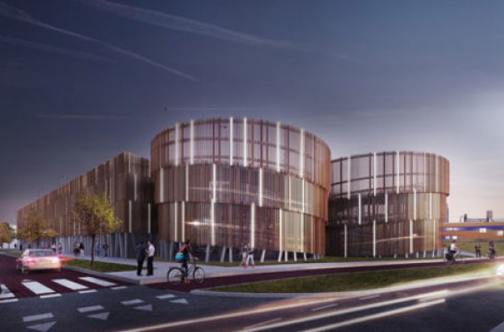 The building is designed as a modern warehouse and refers to the industrial history of the site. The parking garage has an open ground level on slender steel columns, timber façade slats, and two characteristic spiral ramps. This creates a dynamic appearance, plenty of daylight, natural ventilation, and a safe feeling for users.